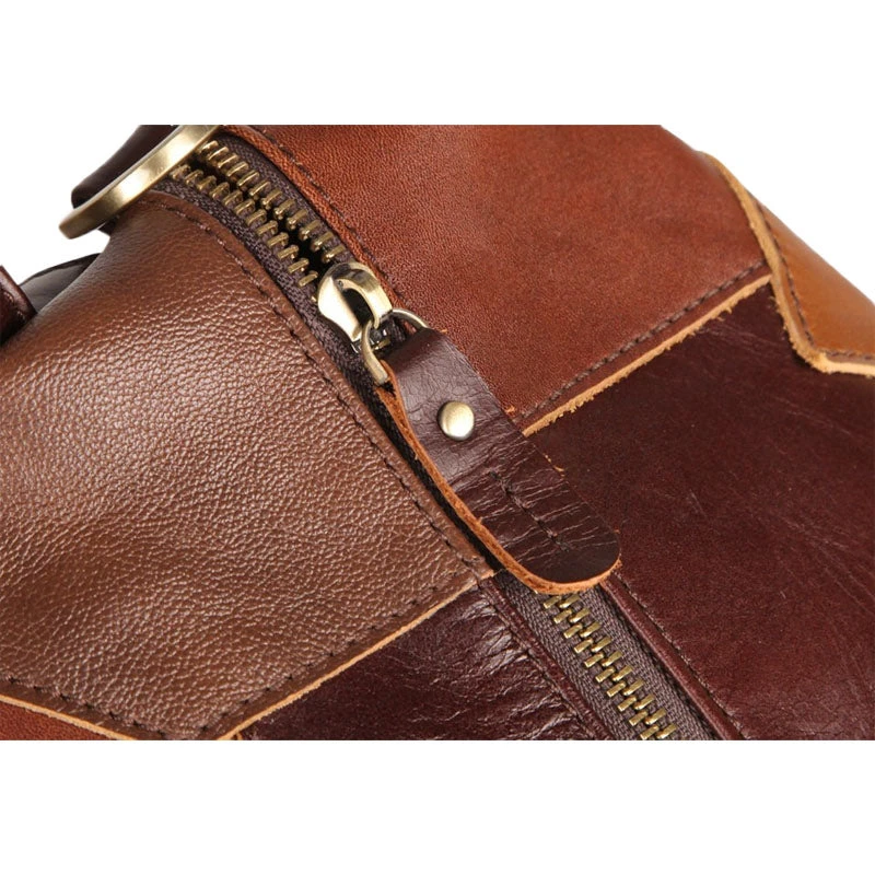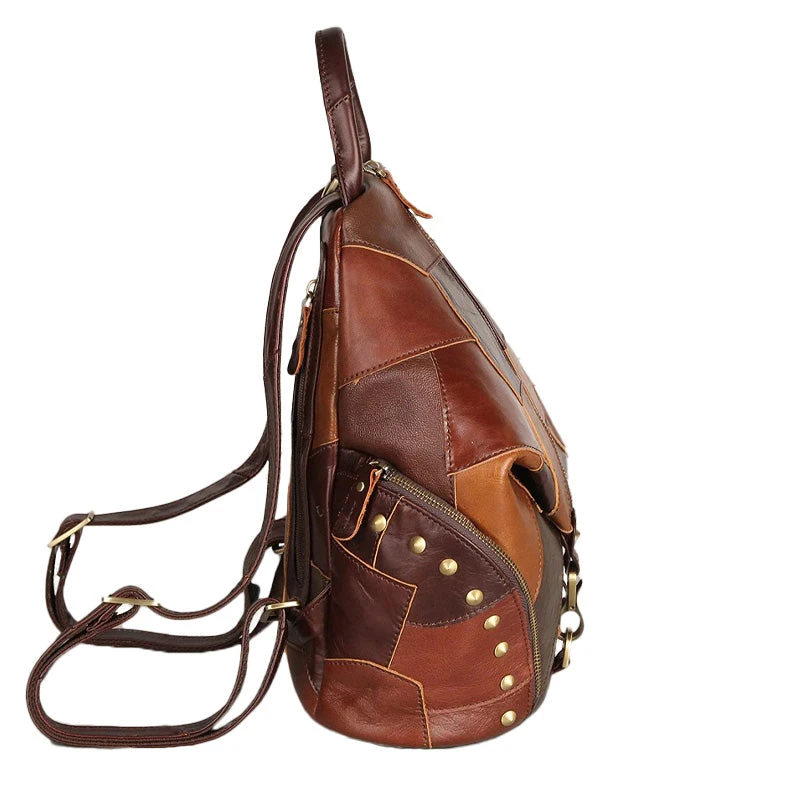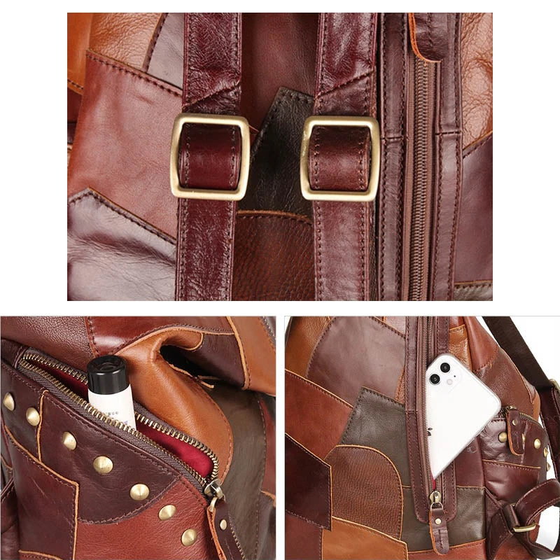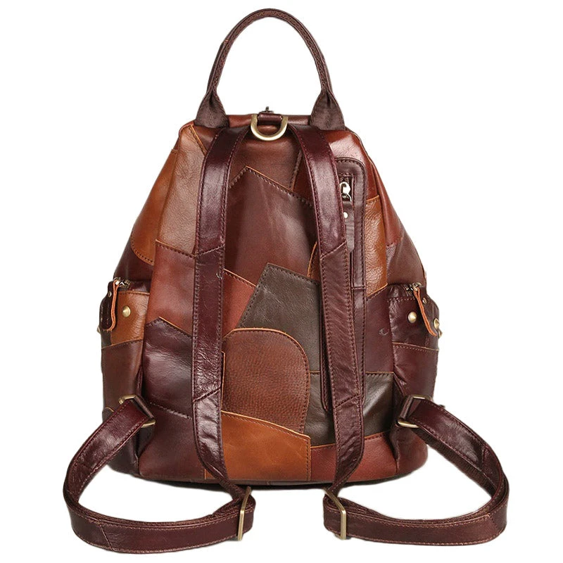 Un style original pour ce sac à dos femme tendance et sa réalisation par empiècement. Des couleurs chaleureuses dans les teintes marron qui s’associeront aisément avec un jean et un blouson en cuir noir par exemple. Nous vous offrons aussi un joli portefeuille long assorti au sac.