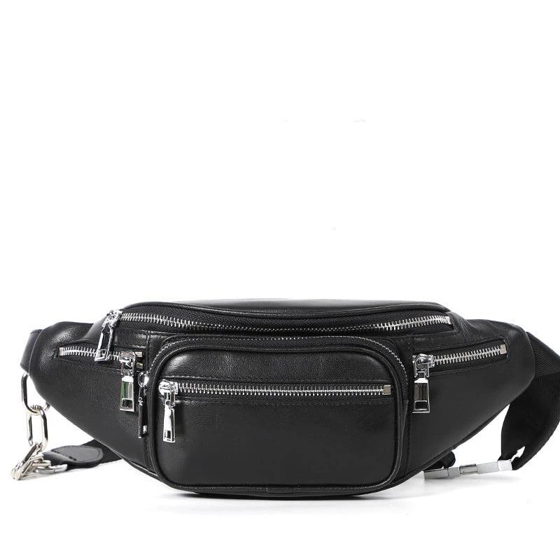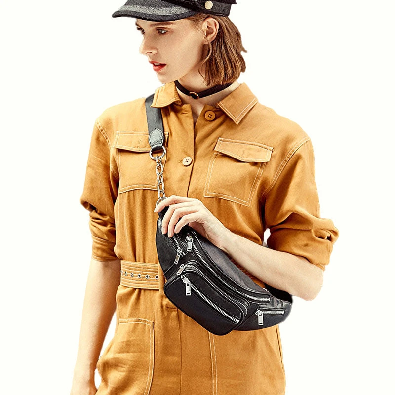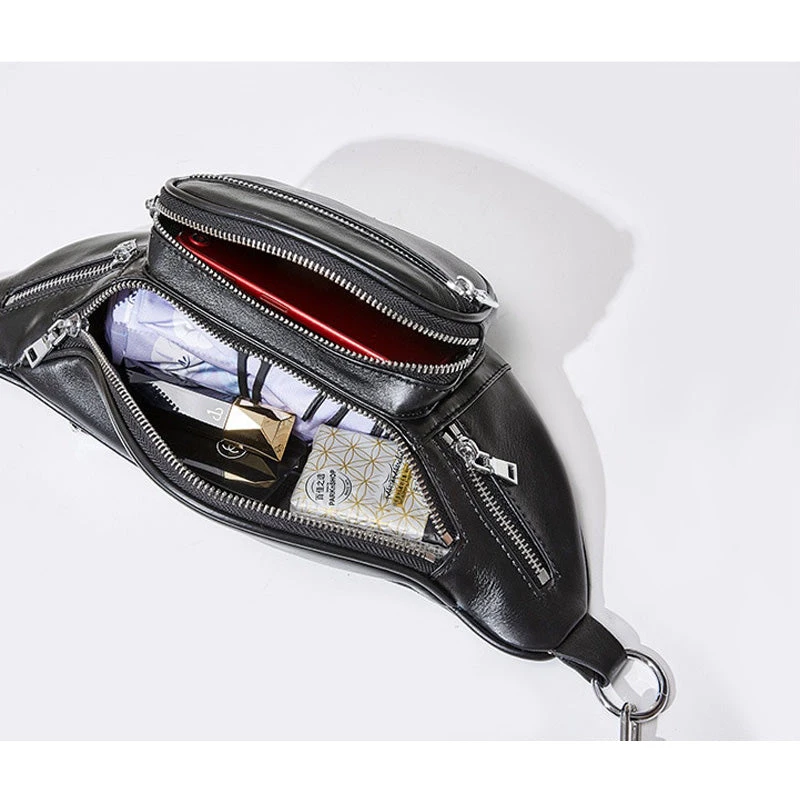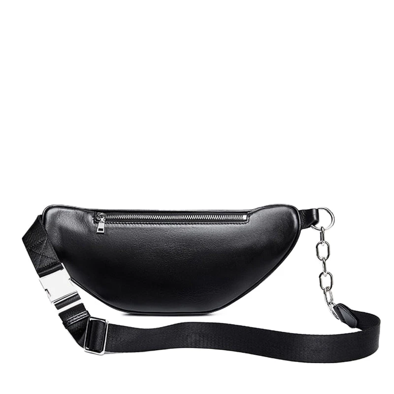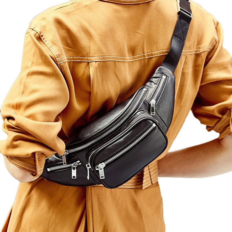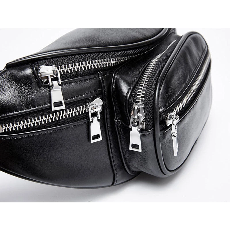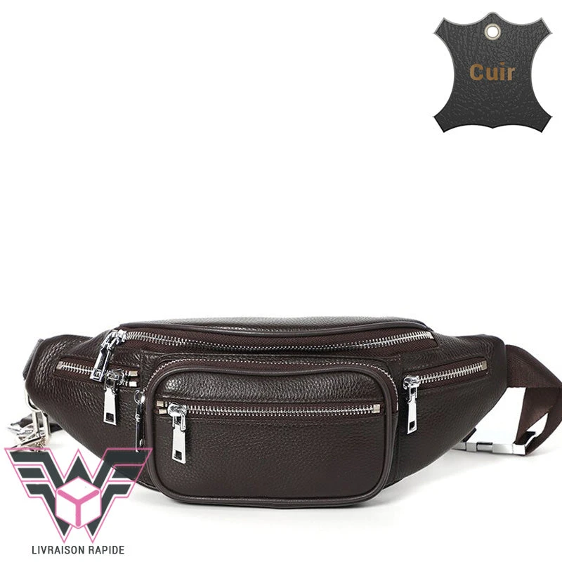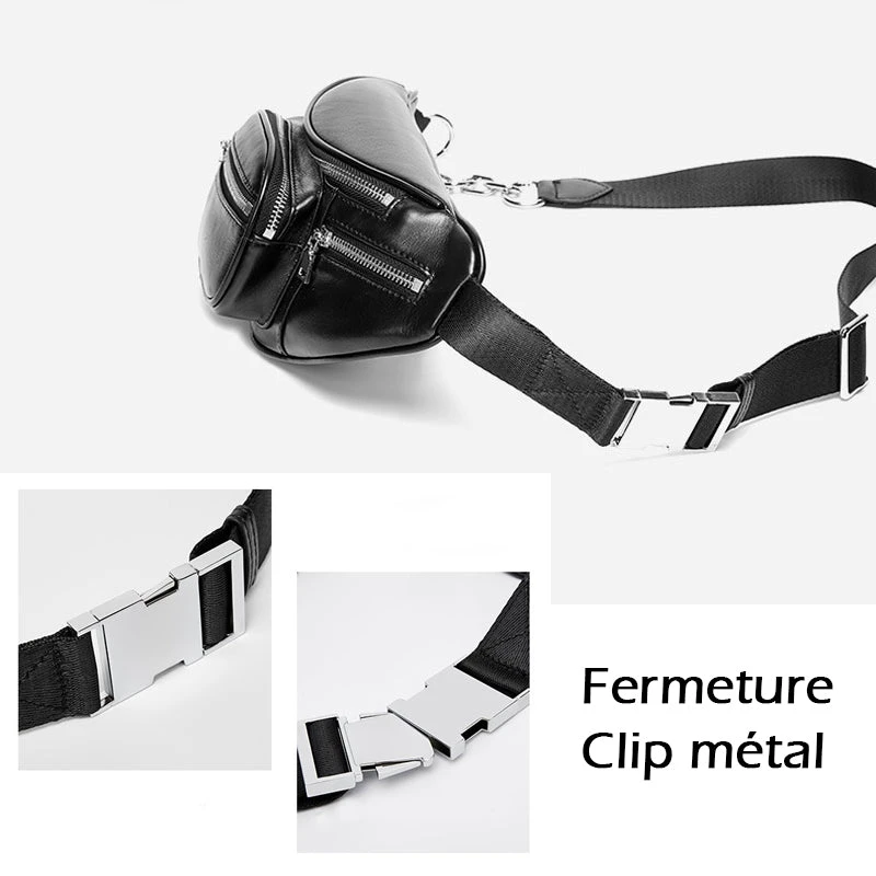 Une très belle sacoche banane femme en cuir véritable ou simili disponible en deux couleurs et deux finitions. Cuir lisse et noir ou aspect brut avec grain du cuir visible (noir ou café). Vous apprécierez aussi sa fermeture clip métal et son look premium. C’est une sacoche banane à utiliser à l’épaule ou en port croisé sur l’avant ou l’arrière